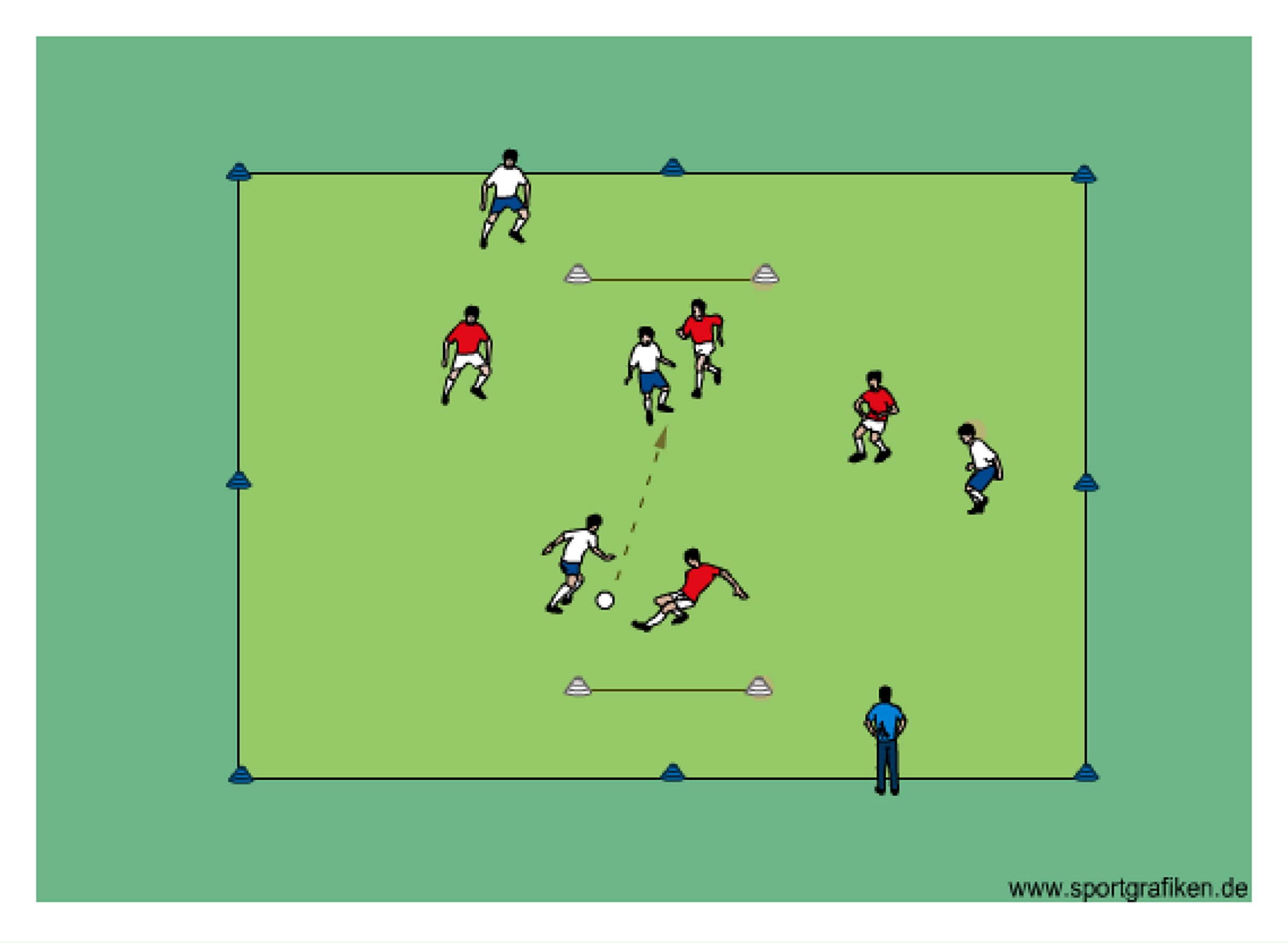 - teams score by dribbling through a cone goal and then passing it to a teammate