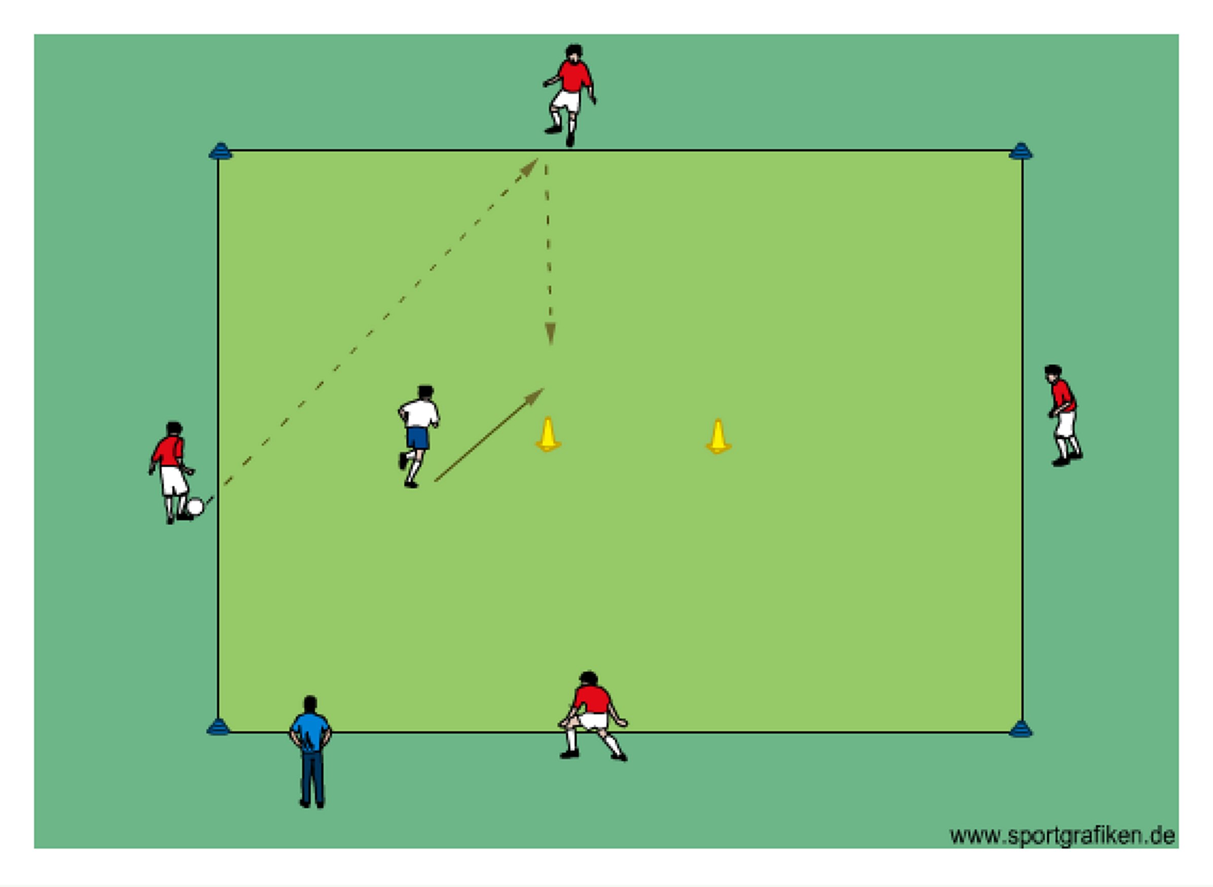 - players on the outside of the grid pass the ball around the defender in the grid in attempt to knock down the cone with a pass