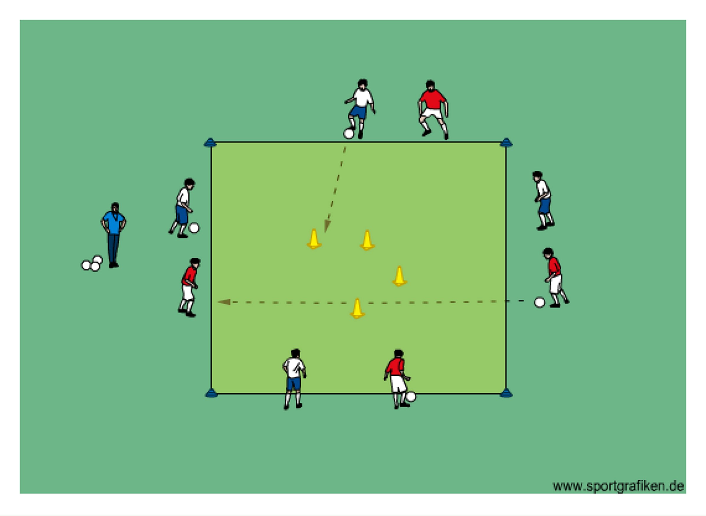 - one player passes the ball towards his partner and tries to knock over a cone in the center grid