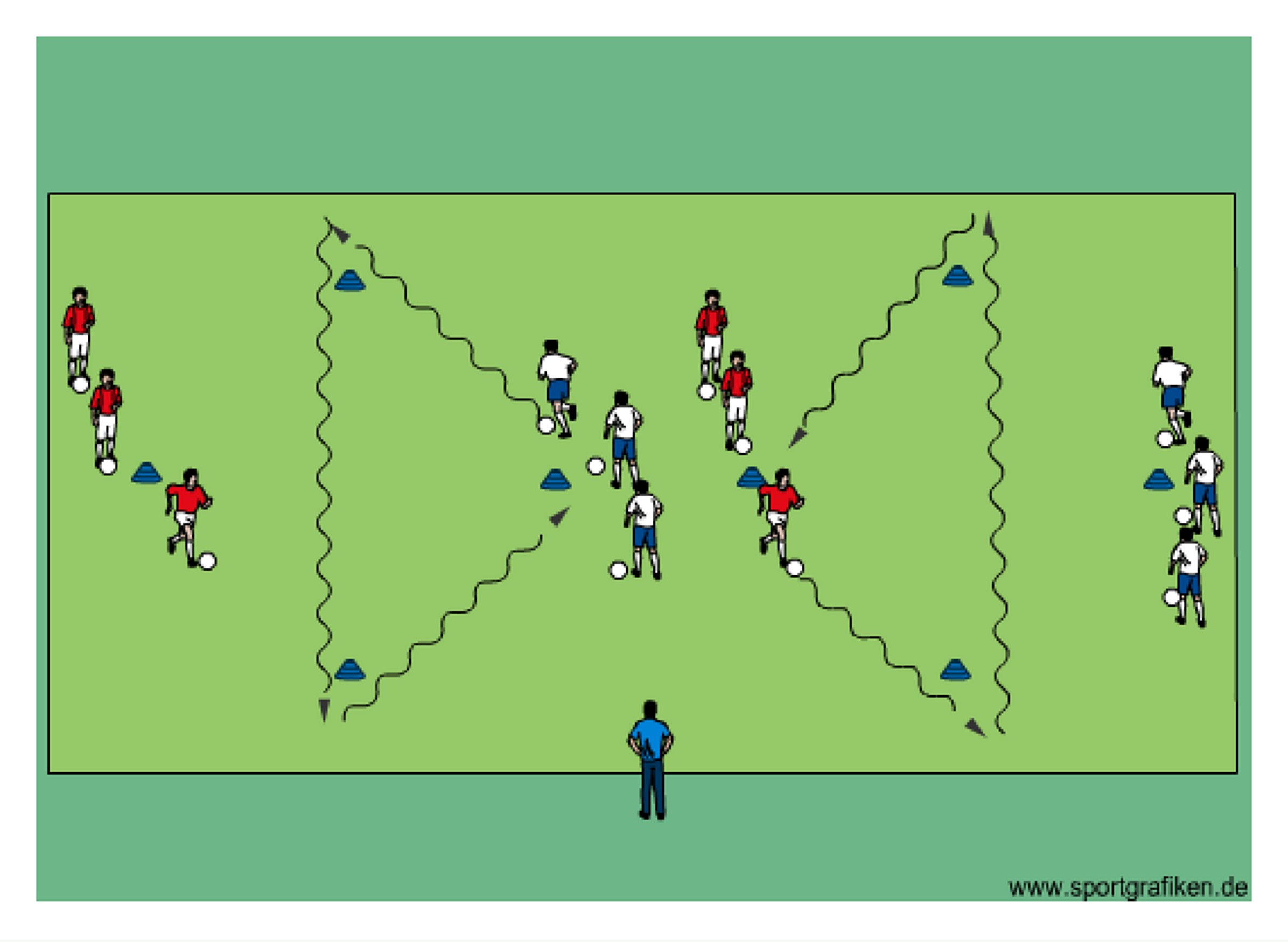- on coach's command first player from each group dribbles around cones as shown
