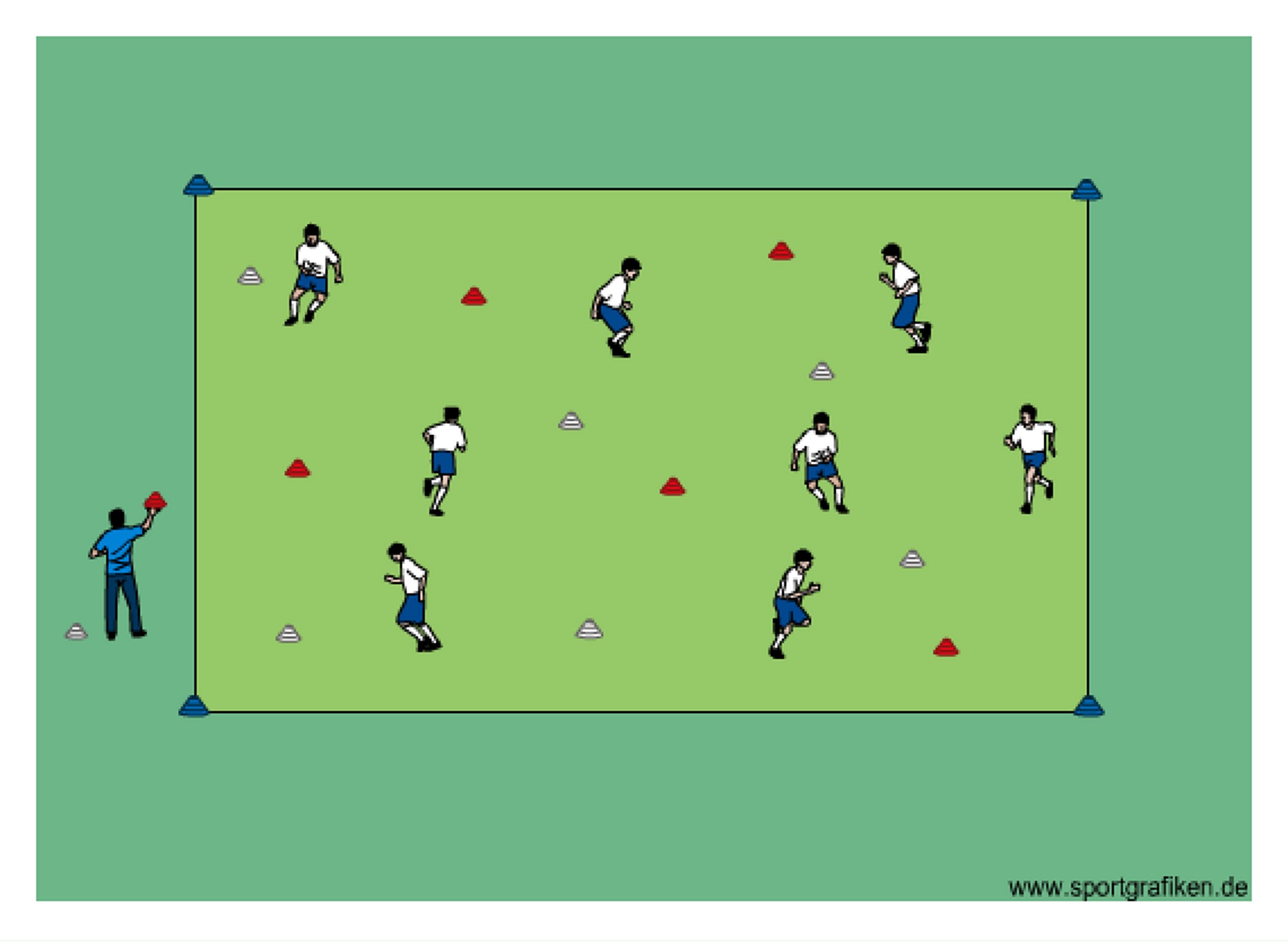 - when coach holds up a colored cone, players then have to dribble around the corresponding cone