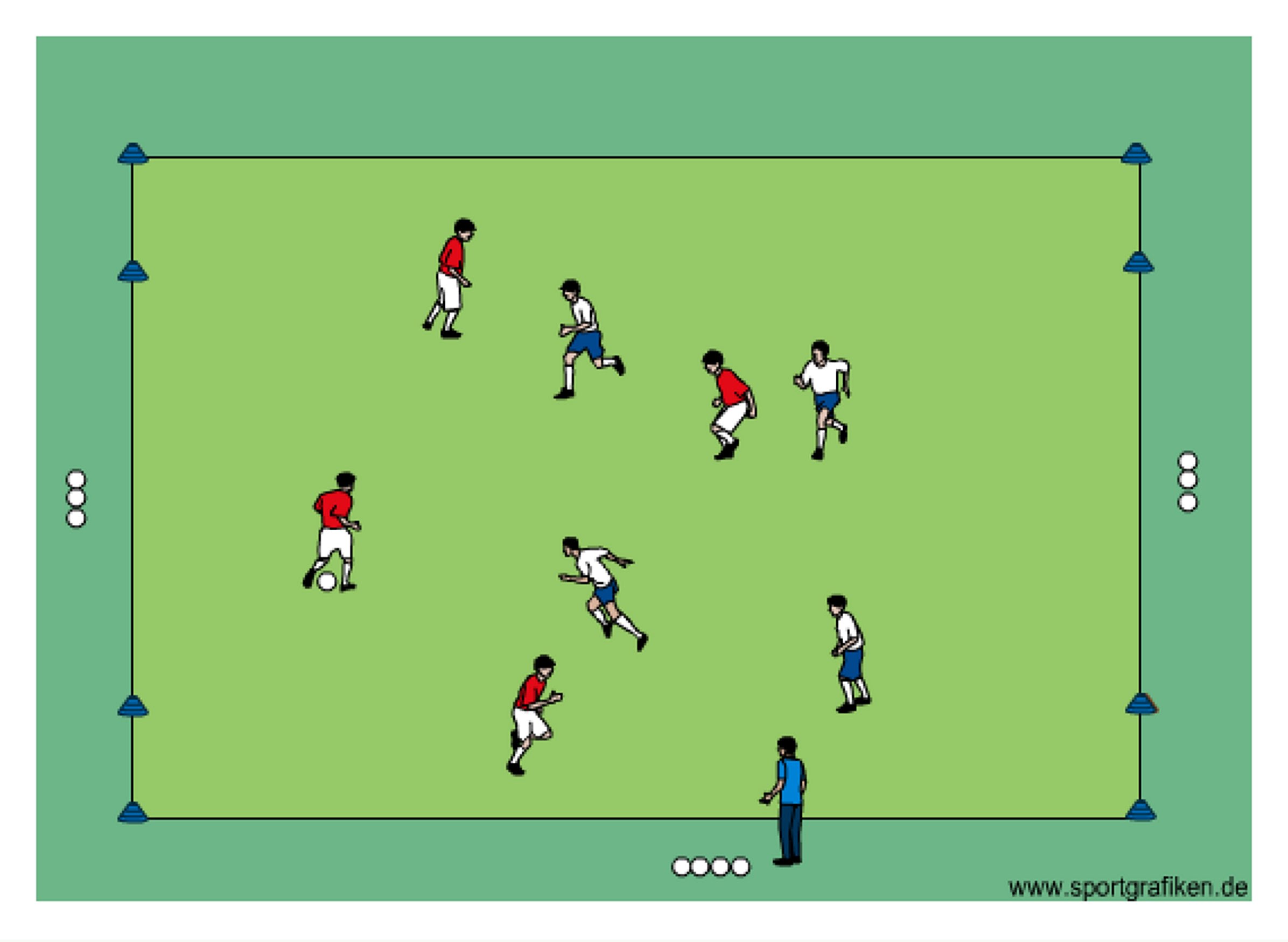 - each team defends and attacks two cone goals