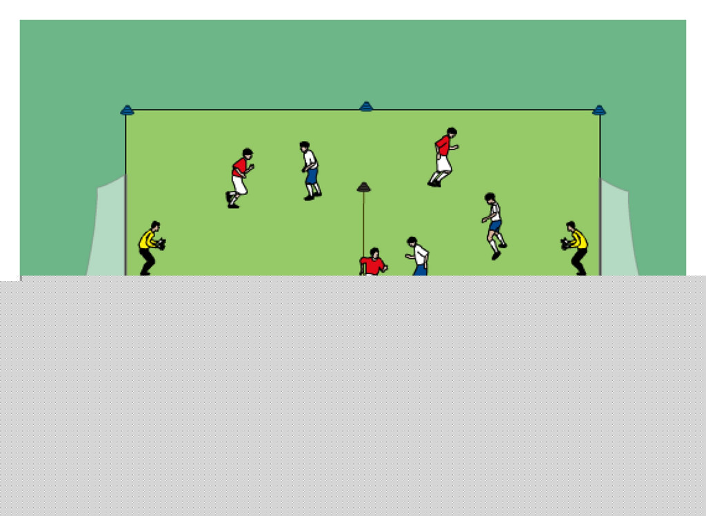 - each team defends and attacks two cone goals