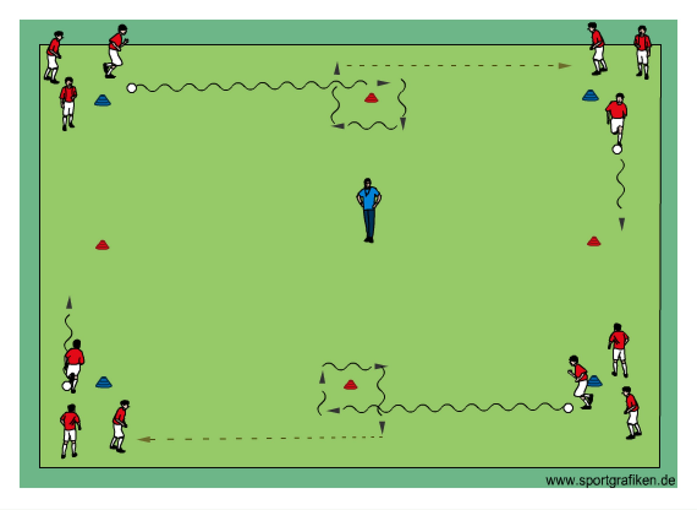 - players make a self pass towards the middle cone, catch up with it and dribble around the cone and