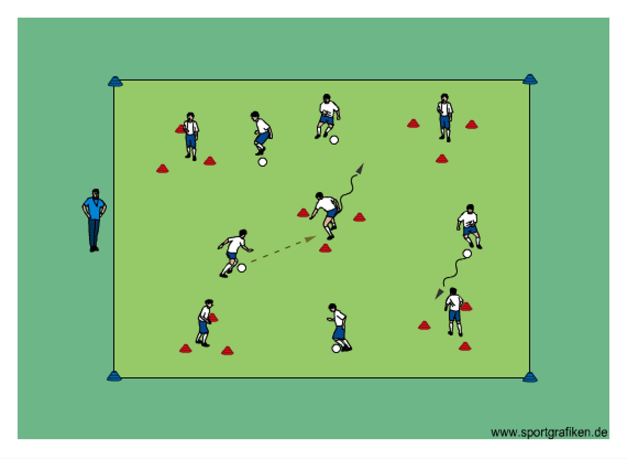- players make a pass to another player inside a triangle who receives the pass and dribbles out of the triangle with speed as shown