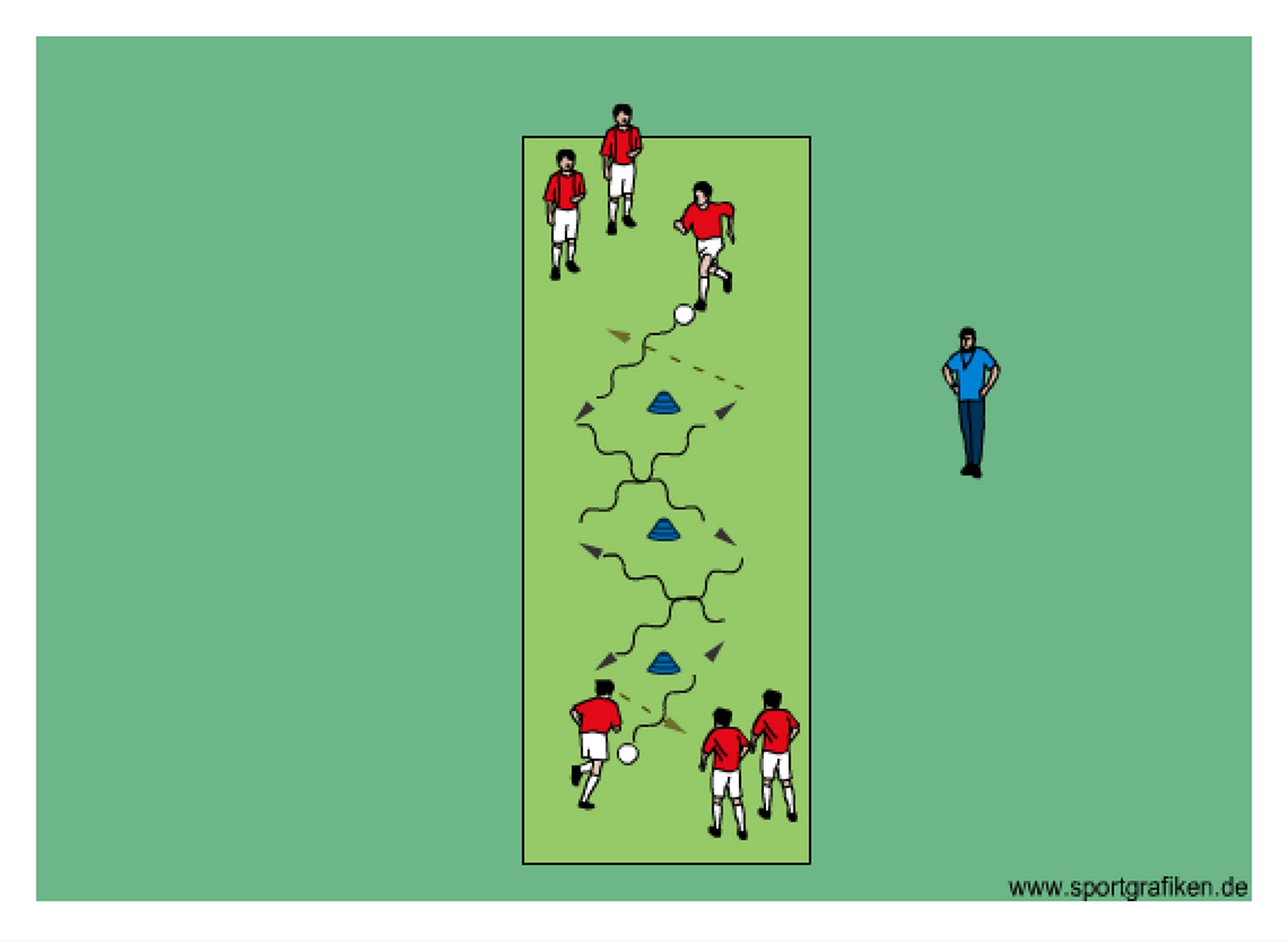 • the first player from each group dribbles zig zac through cones and then makes a short pass to the next player in line as shown