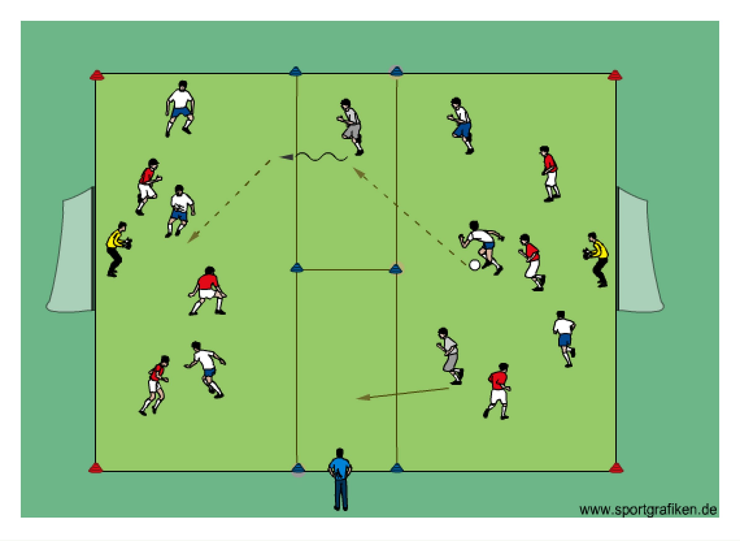 - neutral player then moves into attacking zone to create numbers-up situation (4v3) as shown