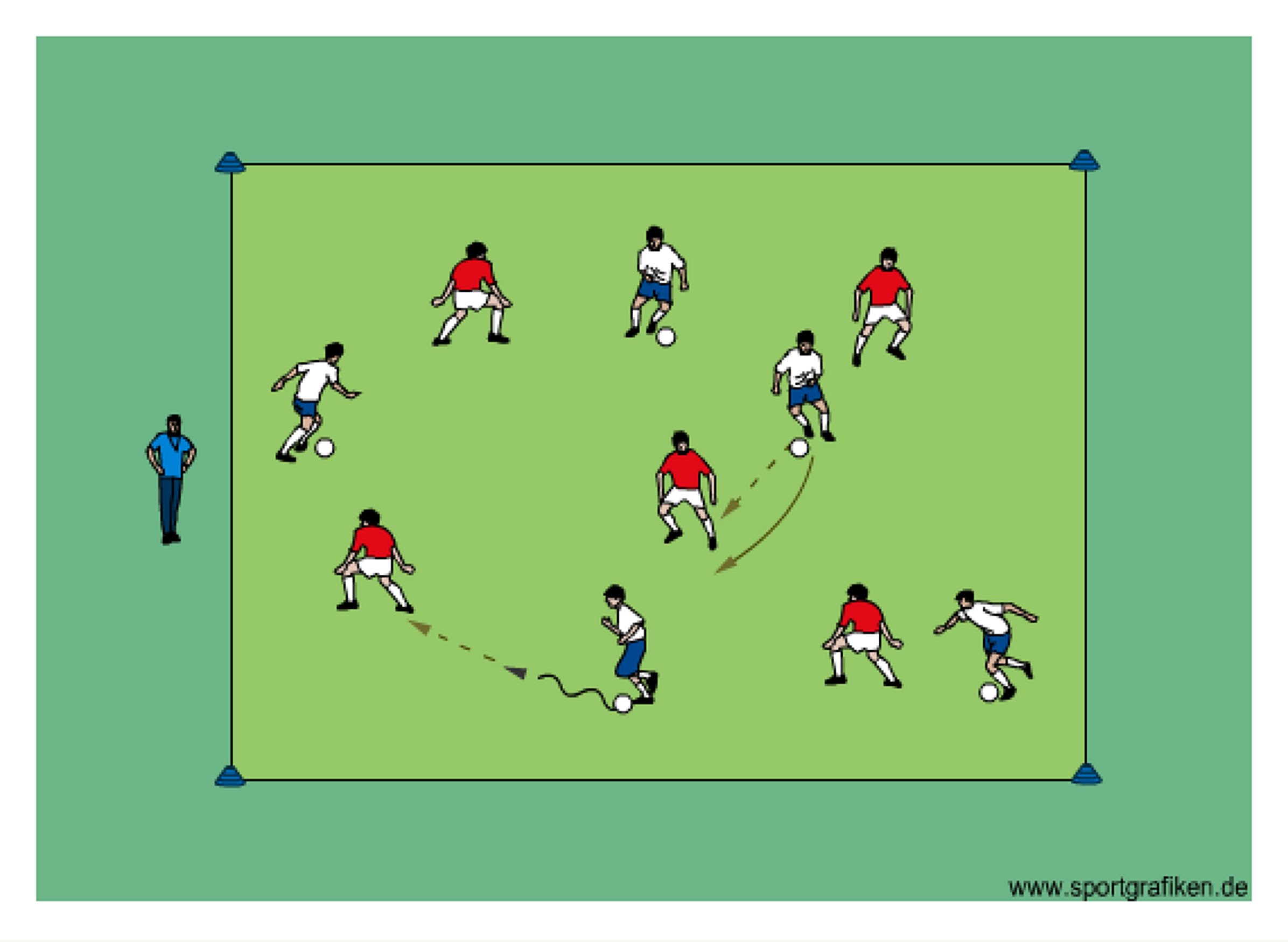 - players make a half moon pass (i.e. pass it past a player to his right and run by him on his left to receive own pass)