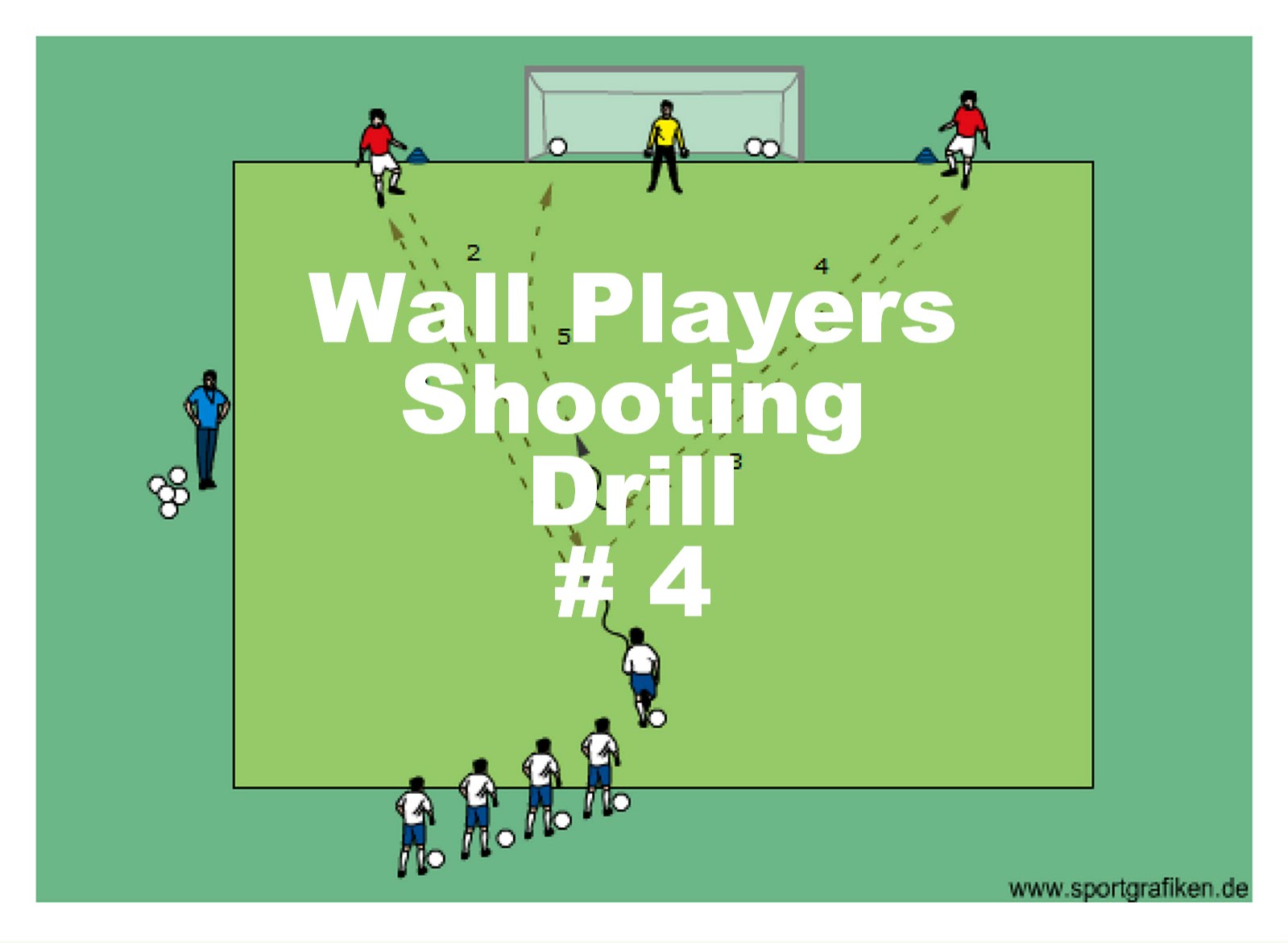 - players play 1-2 passes with wall players one after the other and then shoot on goal with the first touch (second touch)