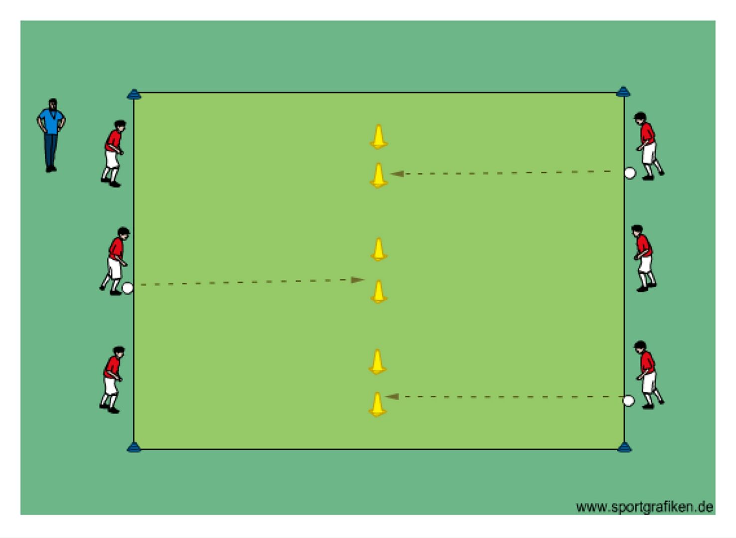 - players play 1-2 passes with wall players one after the other and then shoot on goal with the first touch (second touch)