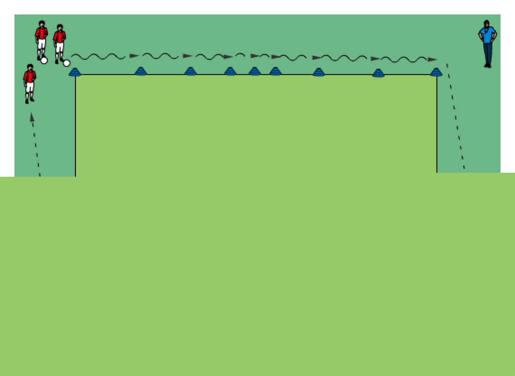 - the players without a ball side shuffles from side to side for appr. 3 yards (the players with a ball make a pass past the player on one side and run around the other side to receive their own pass)