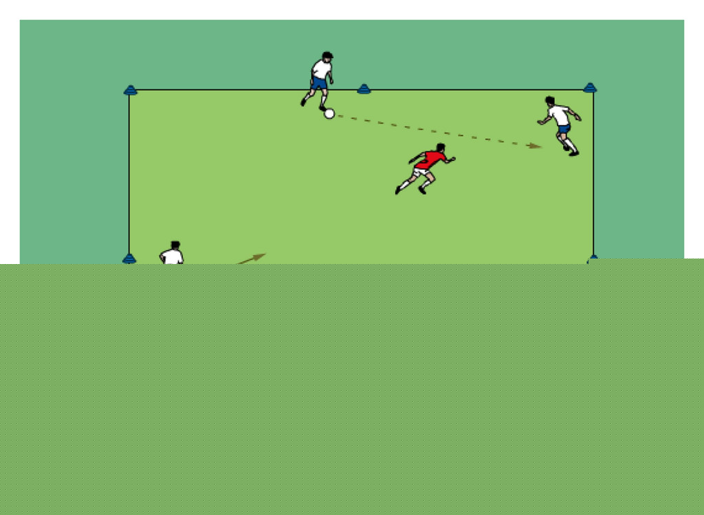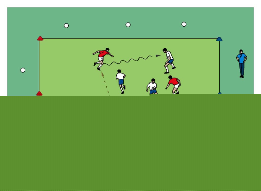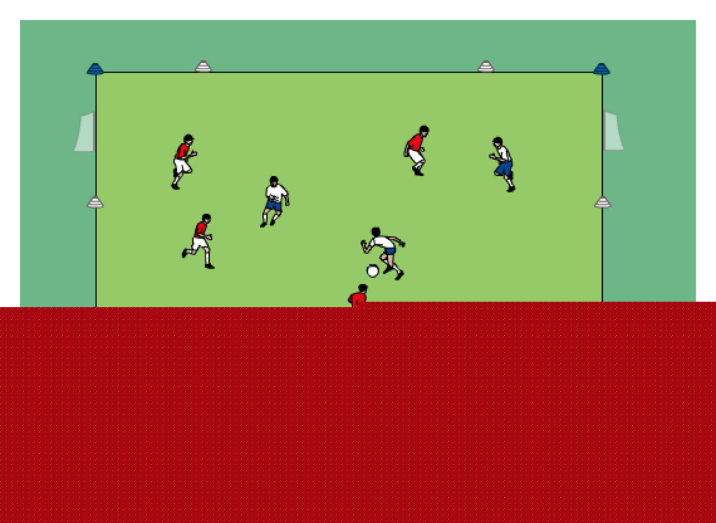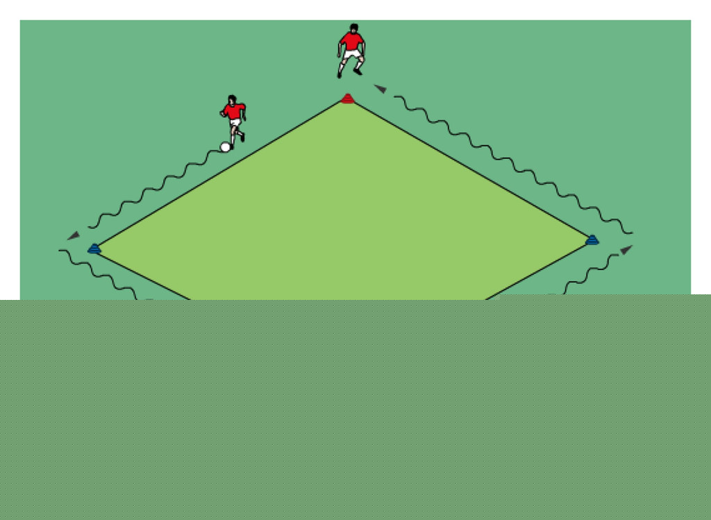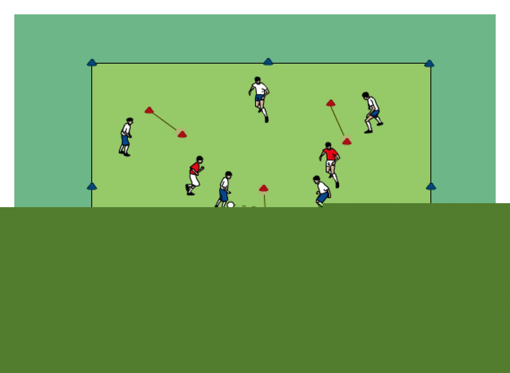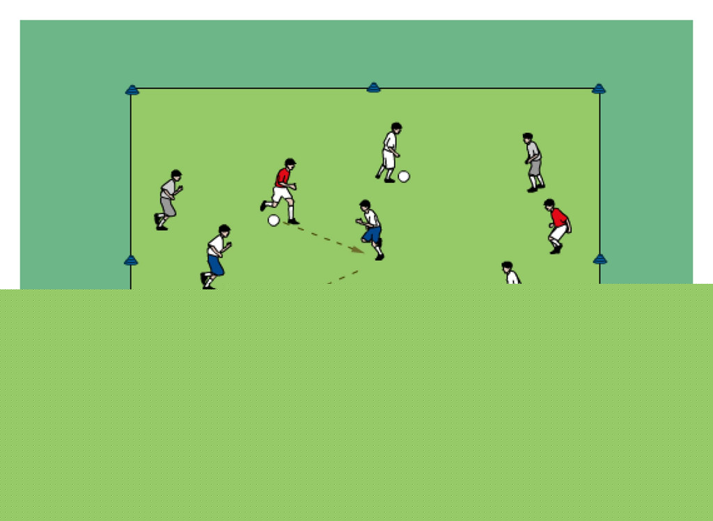 - first player in line dribbles and tries to get past the defender in the middle grid before trying to score on the mini goal