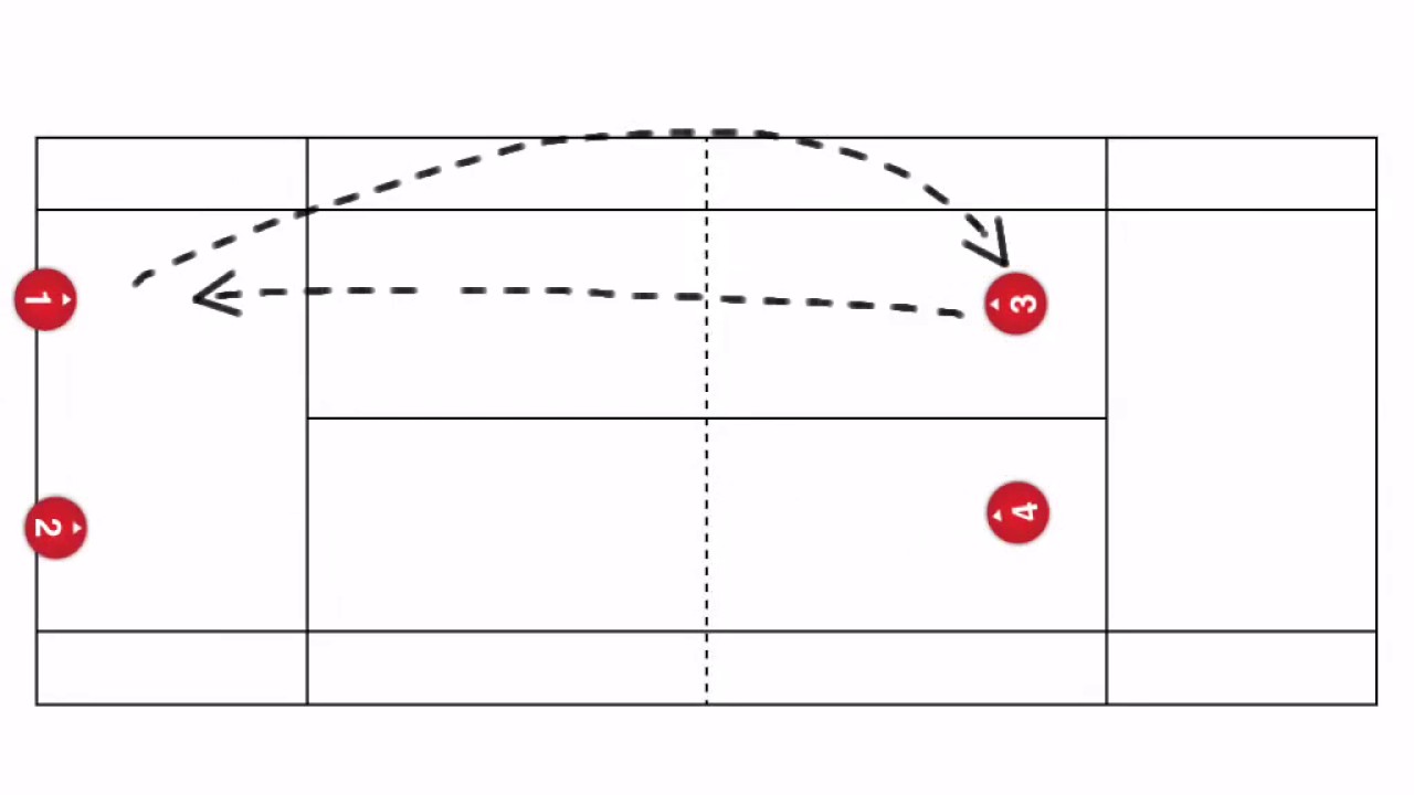 - Two pairs of players (four total) begin crosscourt rallies on both sides of the court