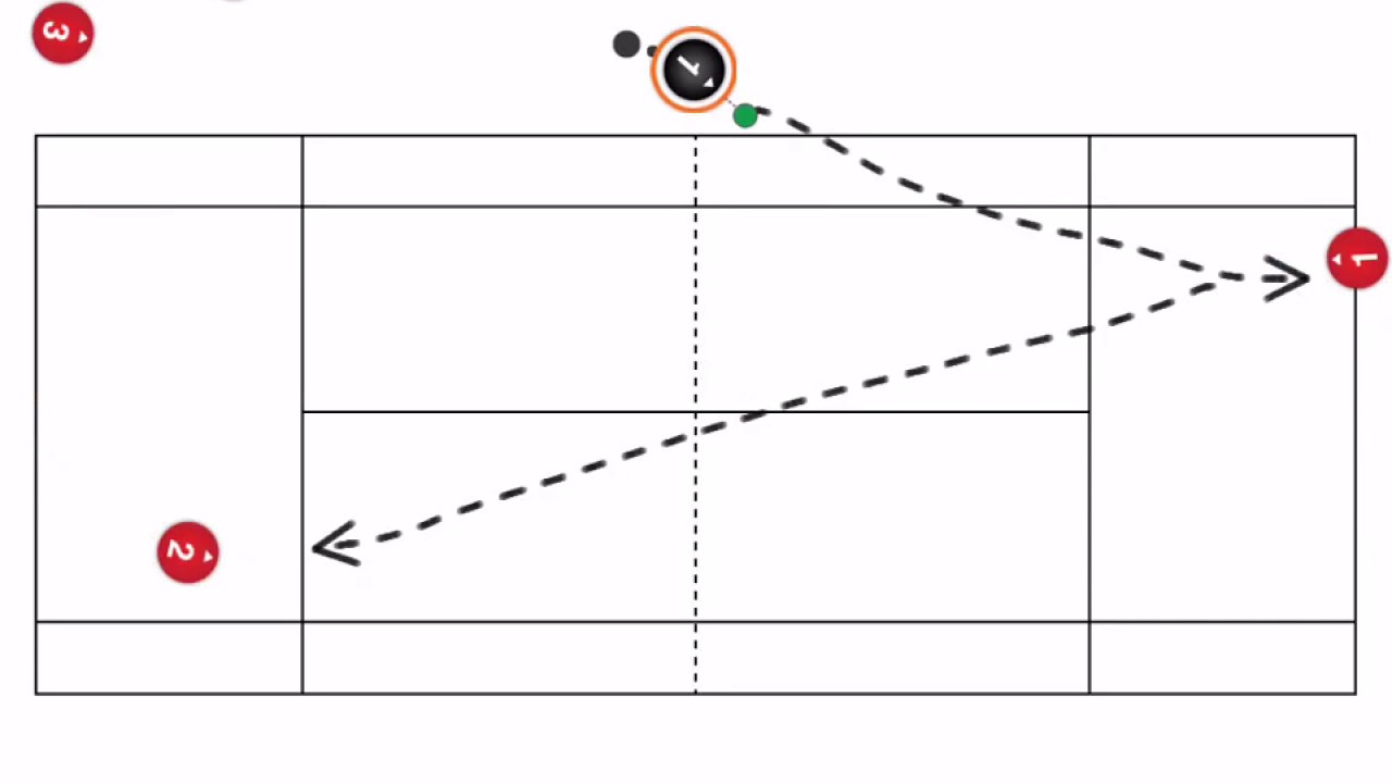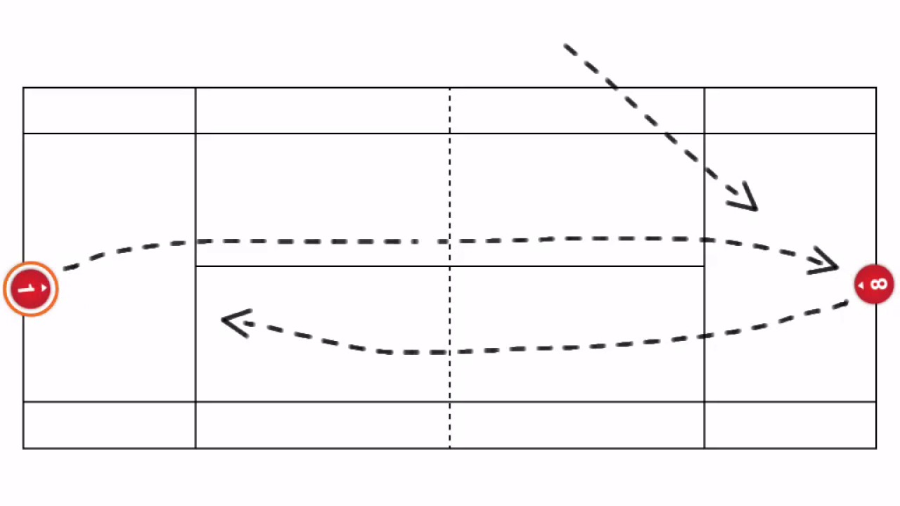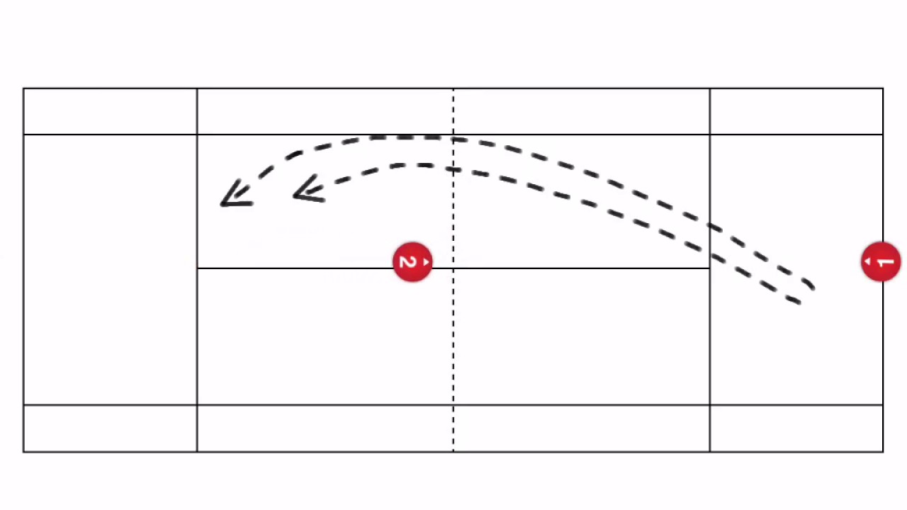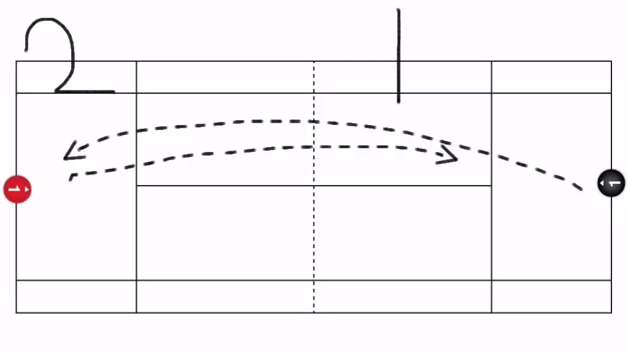 - Two players begin at the baseline: one positioned in the middle, the other on the backhand side