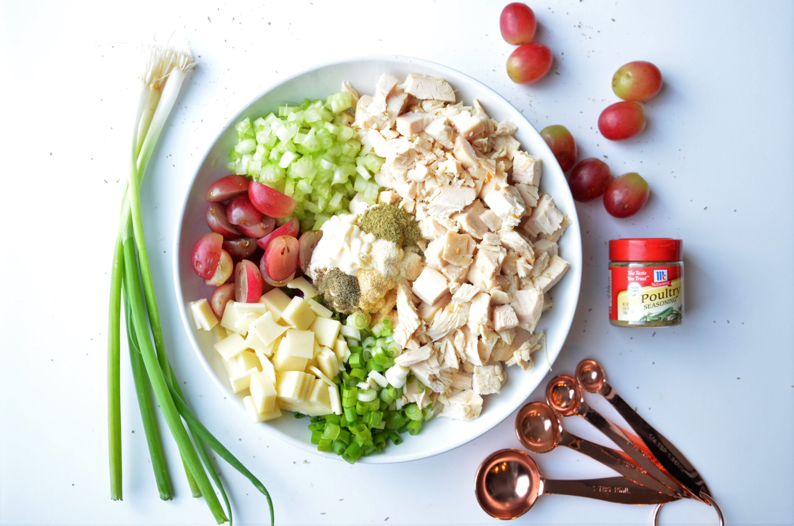 We love chicken around here. Often I will buy a whole rotisserie chicken, use a few pieces for dinner and the leftovers I will turn into my favorite, chicken salad. But sometimes I purchase the entire chicken just for the salad! Mainly, I love it as a sandwich on a ciabatta roll or a croissant. But a lot of times I will eat it with pita chips as a snack. It is the perfect lunch meal or even a party food. Simple, quick, cheap and delicious. This particular recipe has something that I don’t typically add to my salad, poultry seasoning, and lemon juice. But these two combined with standard chicken salad ingredients, take this dish to another level. Tips: You can skip the grapes if you are not a fan of sweet in your salad. Also, you can add walnuts for a nuttier flavor.