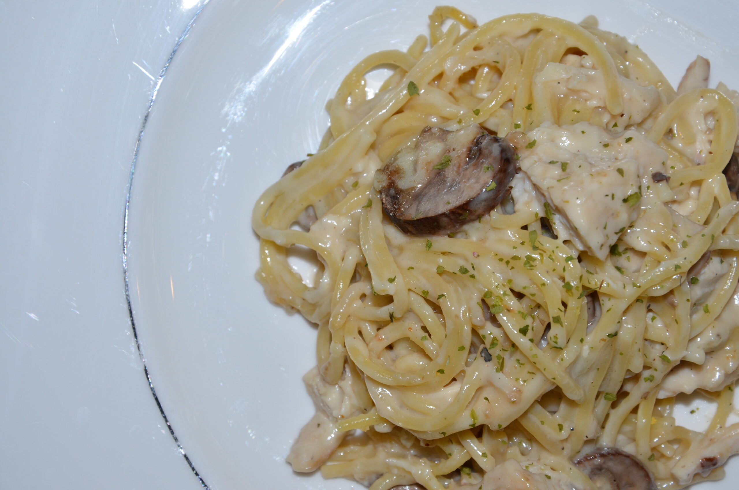 Return to heat, and bring to a low boil for 1 minute, stirring constantly. Stir in cooked spaghetti, mushrooms, and chicken. Pour mixture into the prepared baking dish and top with Parmesan cheese.